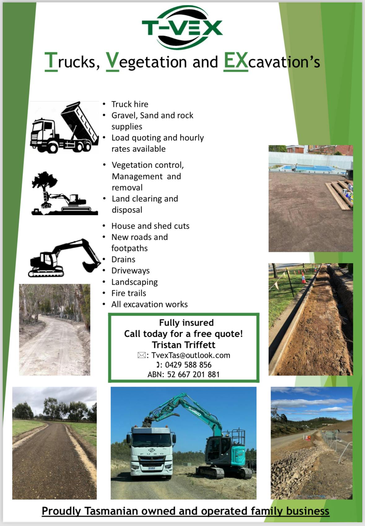 Tvex Pty Ltd brings 17 years of expertise in transport logistics, civil construction, and vegetation management. Though newly established, we are backed by extensive industry knowledge and hands-on experience. We specialise in wet hire services, offering a fleet of tippers and excavators of all sizes to support projects across southern Tasmania and beyond. Our focus is on delivering reliable excavation, land clearing, and construction solutions that ease the load for our clients.